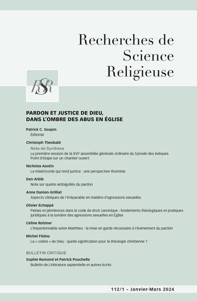 Laissant de côté la « Note de Synthèse » de Christoph Theobald au sujet de la première session de la XVIe assemblée générale ordinaire du Synode des évêques, et le Bulletin final de Littérature sapientielle de Sophie Ramond et Patrick Pouchelle, l’attention se portera sur le noyau de cet important dossier qui traverse pour l’essentiel, depuis l’éditorial signé de Patrick C. Goujon, la difficile question du pardon et de la justice, « dans l’ombre des abus en Église ».