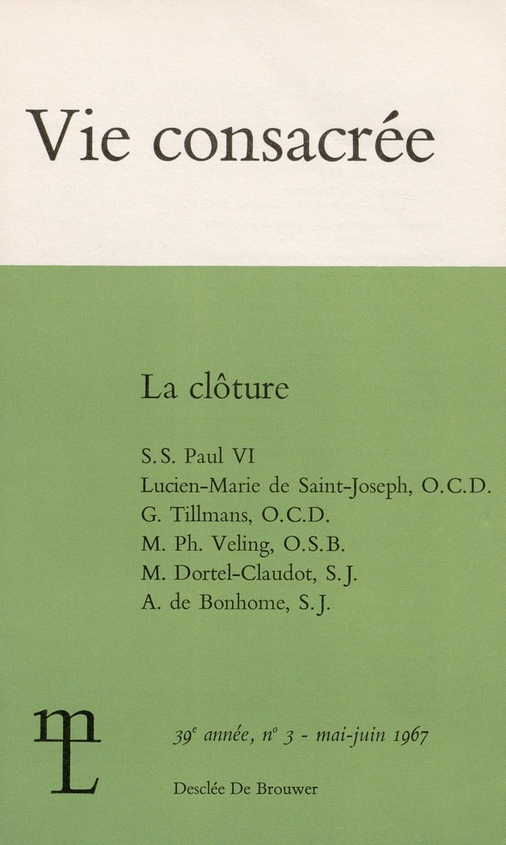 [1] Sur l’histoire de la clôture des moniales, on peut consulter en langue française : en tout premier lieu, Mgr Gérard Huygue, La clôture des moniales des origines à la fin du XIIIe siècle, Roubaix, 1944. – Puis, L. Renoir, art. « Clôture monastique », dans le Dictionnaire d’Archéologie chrétienne et de Liturgie, III, 2024. – J. Creusen, « La clôture, évolution et adaptation », dans R. C. R., 1939, 11, 38, 84 ; art. « Clôture », dans le Dictionnaire de Droit Canonique, III, 890. – E. Jombart et M. Viller, art. « Clôture », dans le Dictionnaire de Spiritualité, II, 979.