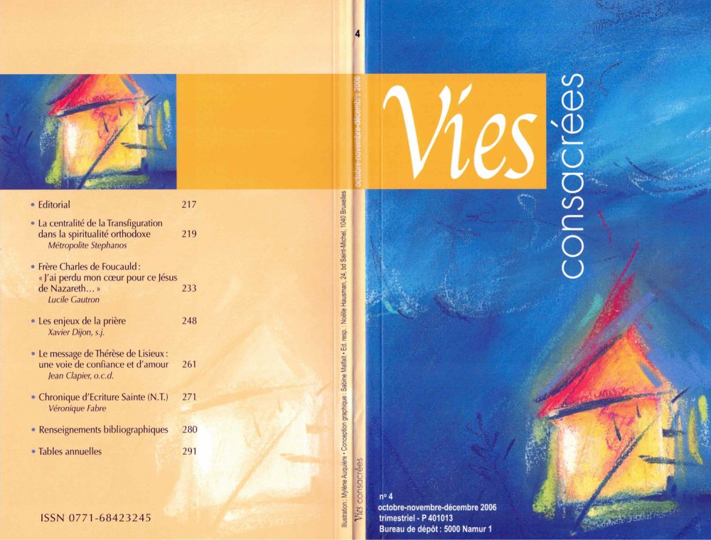 Editorial | Pour célébrer les dix ans de la promulgation de l’exhortation Vita consecrata, nous sommes très heureux d’ouvrir notre dernière livraison de l’année par une importante contribution orthodoxe sur le mystère de la Transfiguration. Le métropolite de Talinn et de toute l’Estonie a en effet bien voulu nous confier le texte de son intervention à la récente Rencontre interreligieuse et interconfessionnelle de Neuendettelsau (Allemagne), elle-même consacrée à « La lumière du mont Thabor. La (...) Voir le numéro