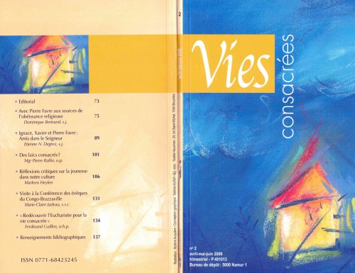 Editorial | Ce numéro de printemps s’ouvre sur un double portrait du bienheureux Pierre Favre, le moins connu des trois Compagnons de Jésus dont on fête cette année les anniversaires : 450 ans de la mort d’Ignace de Loyola, 460 de celle de Pierre Favre, 500 de la naissance de François-Xavier et aussi de Favre... Avec le père D. Bertrand, nous suivrons le chemin de l’aimable Savoyard, passant de l’écoute à l’obéissance, dans cette pratique du discernement des esprits dont les Exercices spirituels sont (...) Voir le numéro